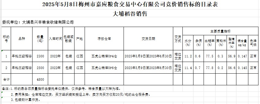 受客戶委托,梅州市嘉應糧食交易中心有限公司定于2025年5月8日(星期四)舉辦糧食競價交易會。大埔縣興豐糧食收儲有限公司擬銷售2022年產早秈稻谷4800噸。