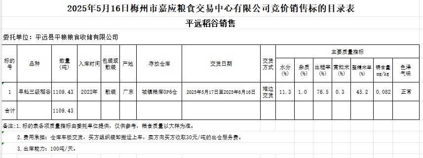 受客戶委托,梅州市嘉應糧食交易中心有限公司定于2025年5月16日(星期五)舉辦糧食競價交易會。平遠縣平糧糧食收儲有限公司擬銷售2022年產早秈稻谷1109.43噸。