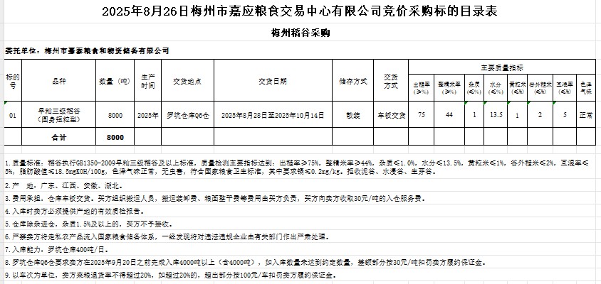 受客戶委托,梅州市嘉應糧食交易中心有限公司定于2025年8月26日(星期二)舉辦糧食競價交易會。梅州市嘉泰糧食和物資儲備有限公司擬采購2025年產早秈稻谷8000噸。