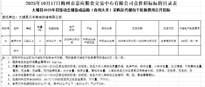 大埔縣2025年縣級動態(tài)儲備成品糧(食用大米)采購及代儲包干輪換費用公開招標公告