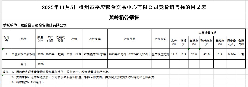 受客戶委托,梅州市嘉應糧食交易中心有限公司定于2025年11月5日(星期三)舉辦糧食競價交易會。蕉嶺縣金穗糧食收儲有限公司擬銷售2023年產(chǎn)中晚秈稻谷2200噸。
