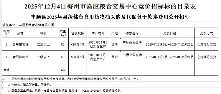 豐順縣2025年縣級儲備食用植物油采購及代儲包干輪換費(fèi)用公開招標(biāo)公告