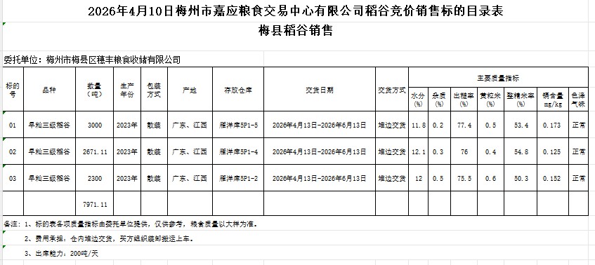 受客戶委托,梅州市嘉應(yīng)糧食交易中心有限公司定于2026年4月10日(星期五)舉辦糧食競(jìng)價(jià)交易會(huì)。梅州市梅縣區(qū)穗豐糧食收儲(chǔ)有限公司擬銷售2023年產(chǎn)早秈稻谷7971.11噸。