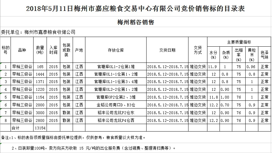受客戶委托,梅州市嘉應(yīng)糧食交易中心有限公司定于2018年5月11日(星期五)舉辦糧食競(jìng)價(jià)交易會(huì),梅州市嘉泰糧食收儲(chǔ)公司擬銷(xiāo)售早秈稻13154噸。