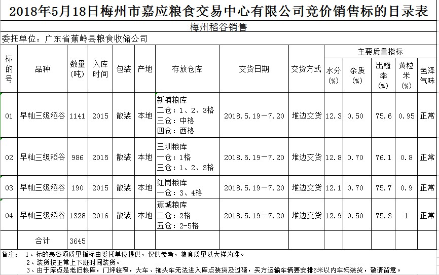 受客戶委托,梅州市嘉應(yīng)糧食交易中心有限公司定于2018年5月18日(星期五)舉辦糧食競價(jià)交易會(huì),廣東省蕉嶺縣糧食收儲(chǔ)公司擬銷售早秈稻3645噸。