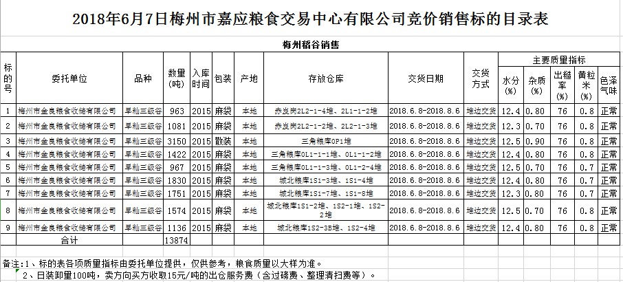 受客戶委托,梅州市嘉應(yīng)糧食交易中心有限公司定于2018年6月7日(星期四)舉辦糧食競(jìng)價(jià)交易會(huì),梅州市金良糧食收儲(chǔ)有限公司擬銷售早秈稻13874噸。