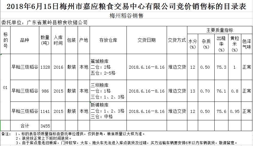 交易時間和地點:2018年6月15日(星期五)上午10時15分。廣東省梅州市彬芳大道南161號梅州市糧食交易中心3樓。