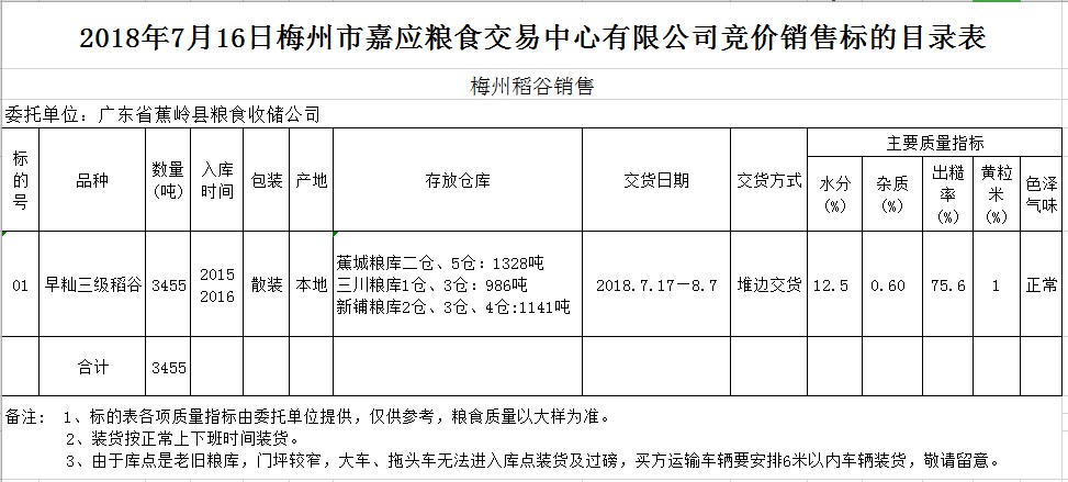 受客戶委托,廣東省蕉嶺縣糧食收儲公司定于2018年7月16日(星期一)舉辦糧食競價交易會,擬銷售早秈稻3455噸。
